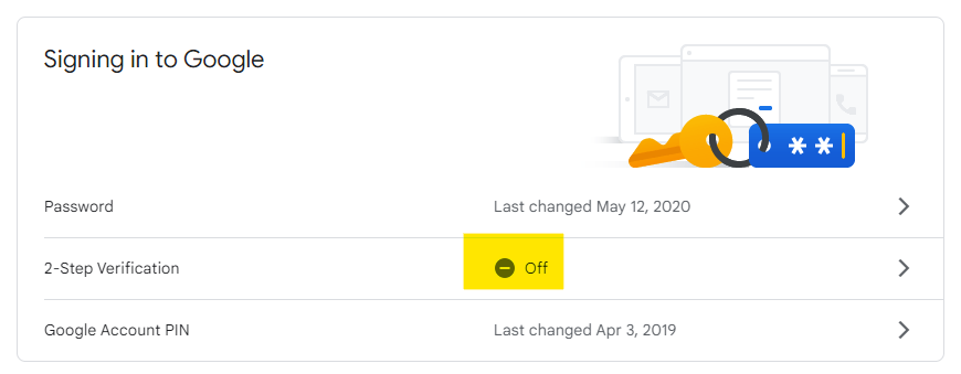 - Under “Signing in to Google,” select 2-Step Verification