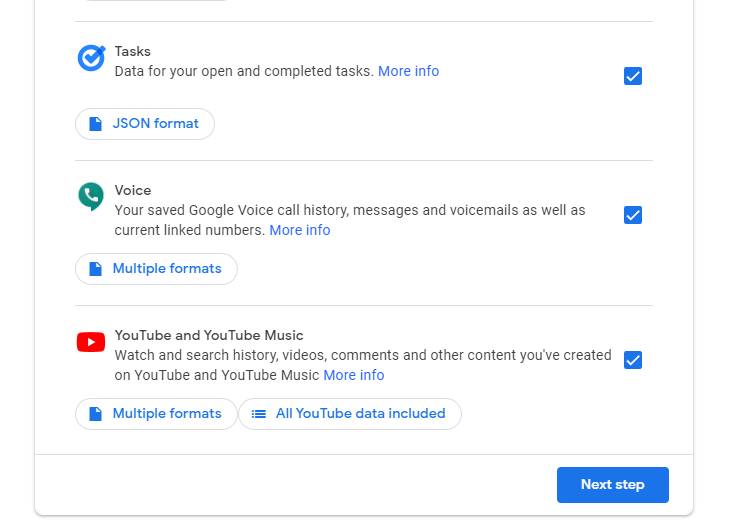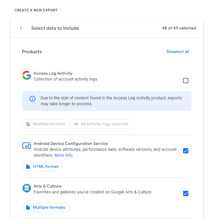 - We recommend leaving "Access Log Activity" unchecked when exporting other data. If you have a reason to export this data, you can perform a separate Takeout request after your initial export.