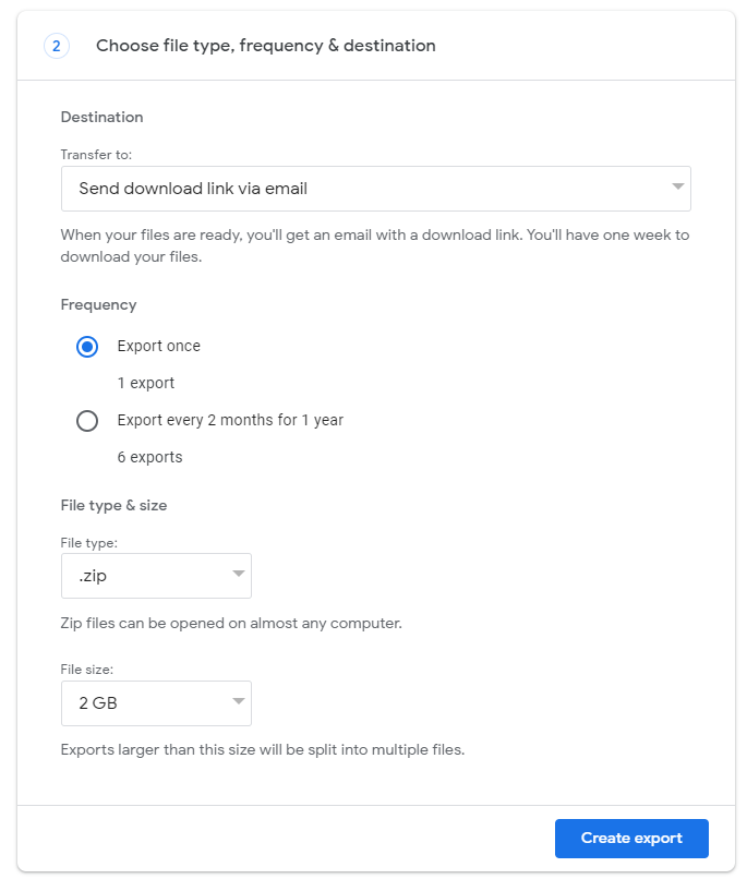 This process can take a long time (possibly hours or days) to complete. You'll receive an email when your export is done." and you'll find an email with links to the Takeout files in your email once the export is complete.