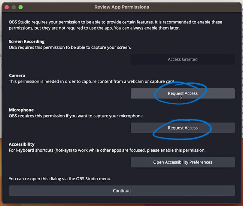 Standard users can provide access to the camera and microphone permissions for OBS Studio. Click the Request Access button on the screen that pops up on the first run after installing.