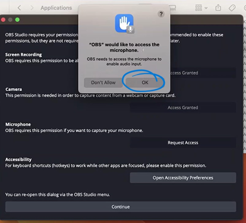 Click OK to verify that you would like to allow OBS to have access to your microphone or Camera. Portions of the app will not function without this.