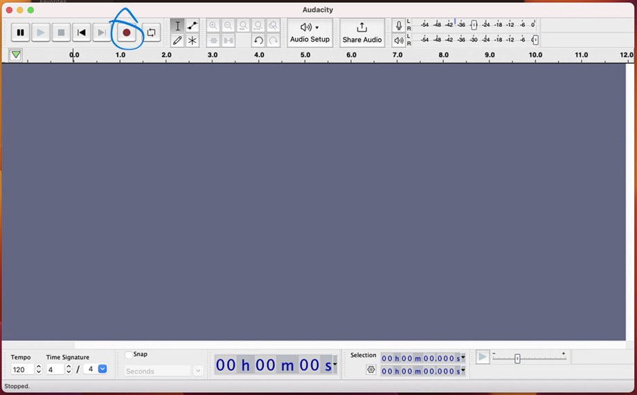 Audacity has been installed on your Macbook. You can find it in the Applications folder. Open the app and click the "record" icon.