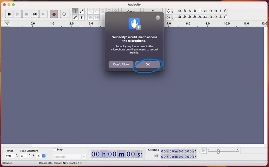 Click the OK button to allow. You will now be able to record in Audacity.